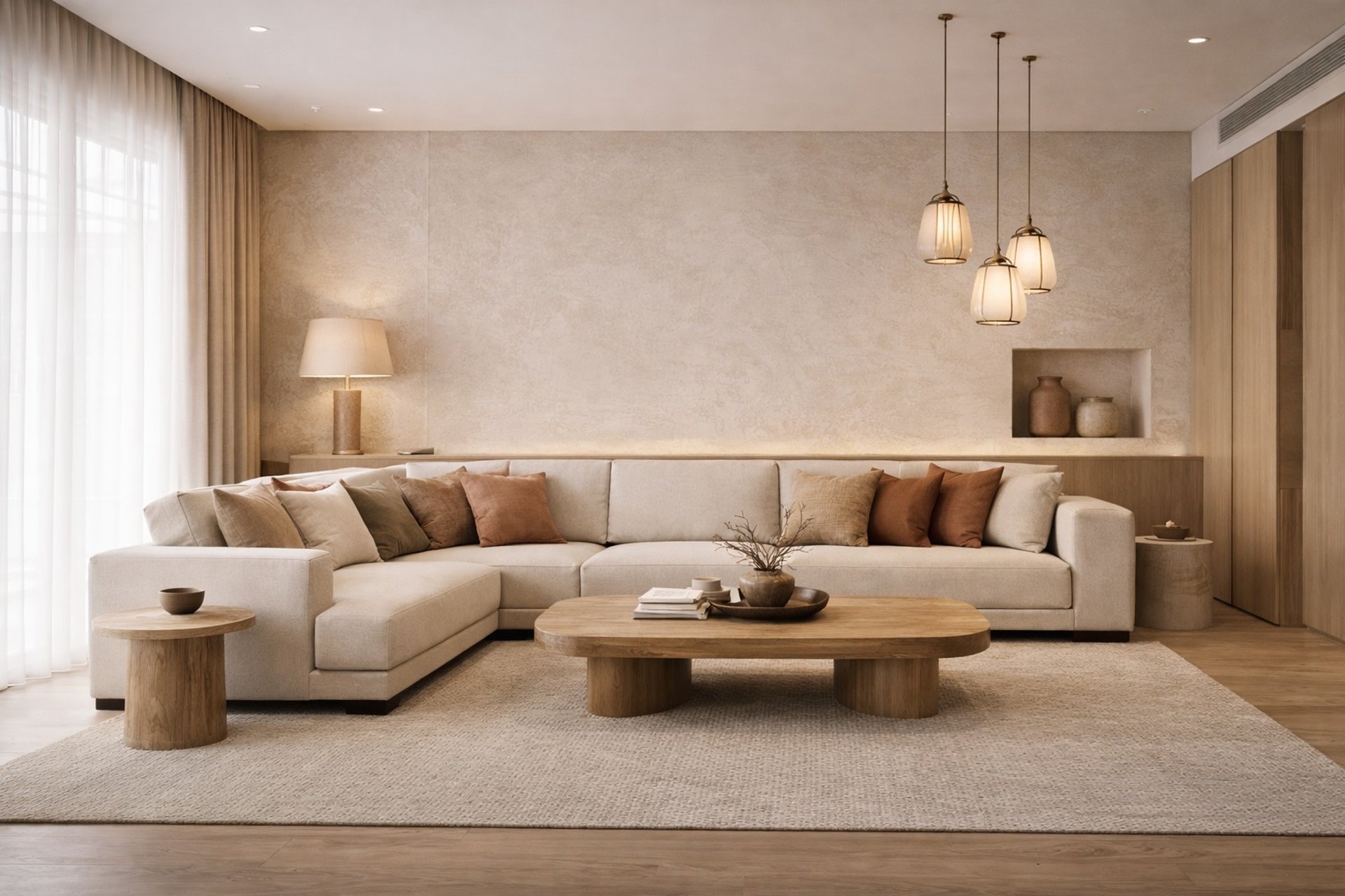 This approach favours limewash finishes, natural stone, warm timbers, and organic forms that interact softly with daylight. Interiors feel calm and grounded, allowing shadow and texture to become part of the spatial experience rather than relying on visual contrast.
